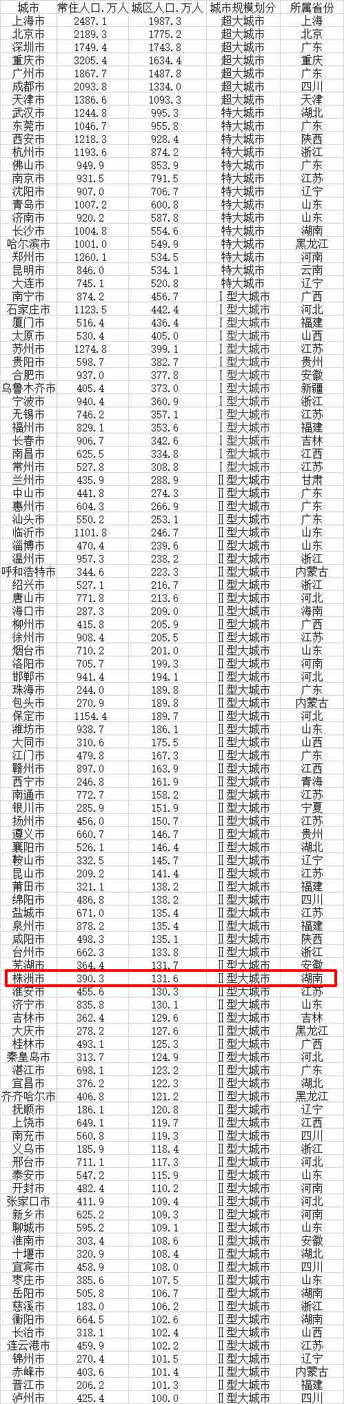 再次,统计口径的因素影响。地级及以上城市的城区人口数据不包括下属县级市、县的城区人口数据。因此,虽然有一些地级市城区和下辖的县市城区已经连片发展,但是这些下辖的县市城区人口均不纳入地级市城区人口统计。