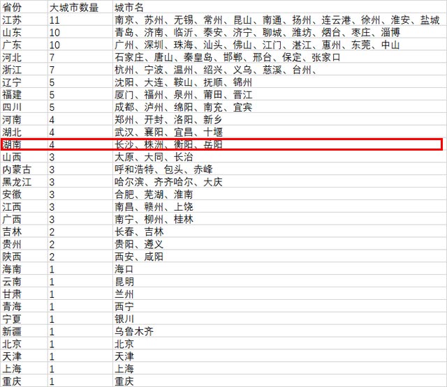分省份来看,第二经济大省江苏最多,达到11个,包括10个设区市和昆山这个县级市,其省会城市南京的城区人口达791.5万人,处于特大城市行列。
